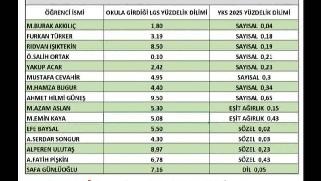 Bu gurur tablosunu birlikte oluşturan öğrencilerimizi, fedakâr öğretmenlerimizi ve kıymetli ailelerini yürekten tebrik ediyor; eğitim yolculuğumuzda kararlılıkla ilerlemeye devam ediyoruz.